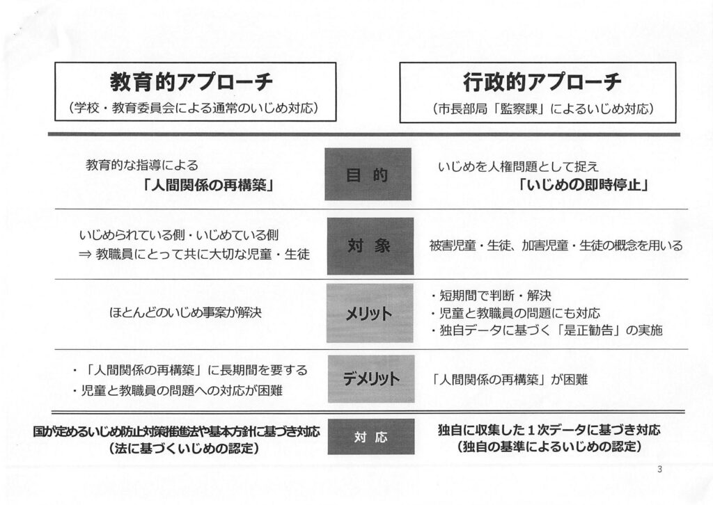 この監察課と教育委員会が連携し、以下の二本立てで対応しています。