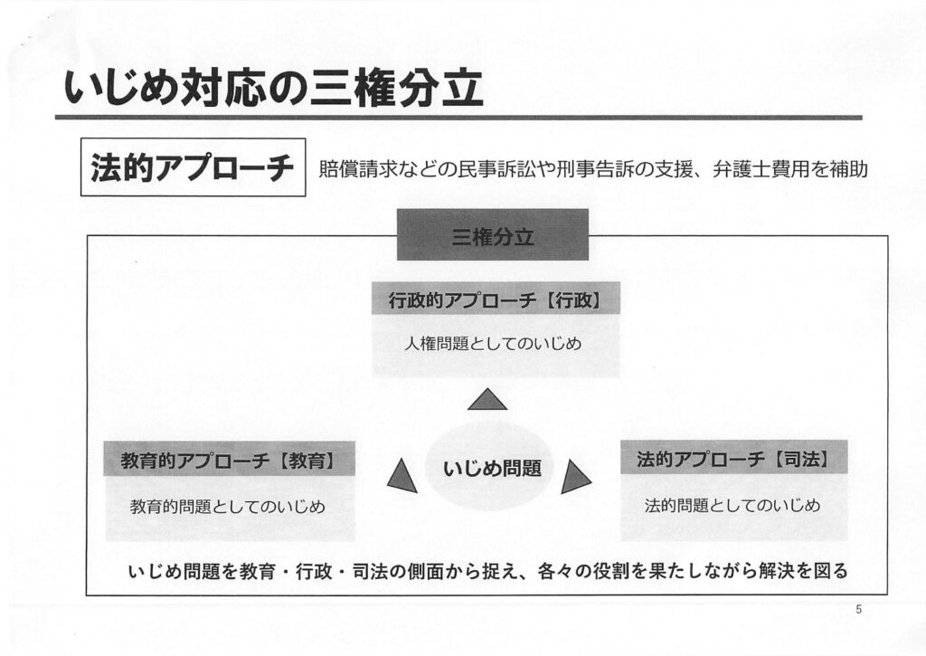 いじめを人権問題として位置づけ、即時停止・早期解決を重視。必要に応じて法的支援も行う体制です。