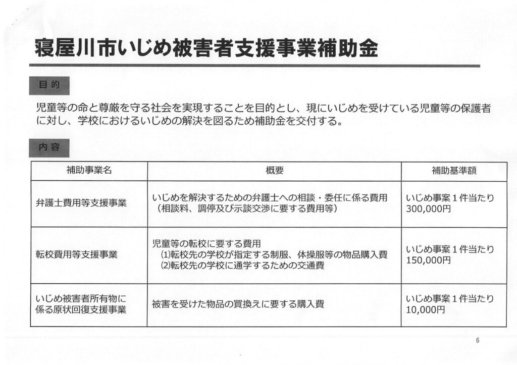 被害児童・生徒や保護者への支援として、「いじめ被害者支援事業補助金」制度を設けています。