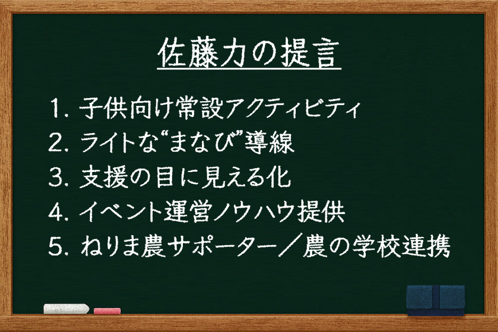 - 子供向け常設アクティビティ: 虫・植物カード、季節のスタンプラリー、畑ミッションで年間を通じて来園の理由を創出。