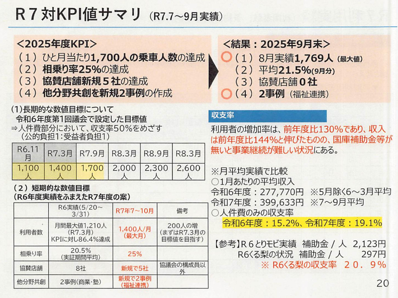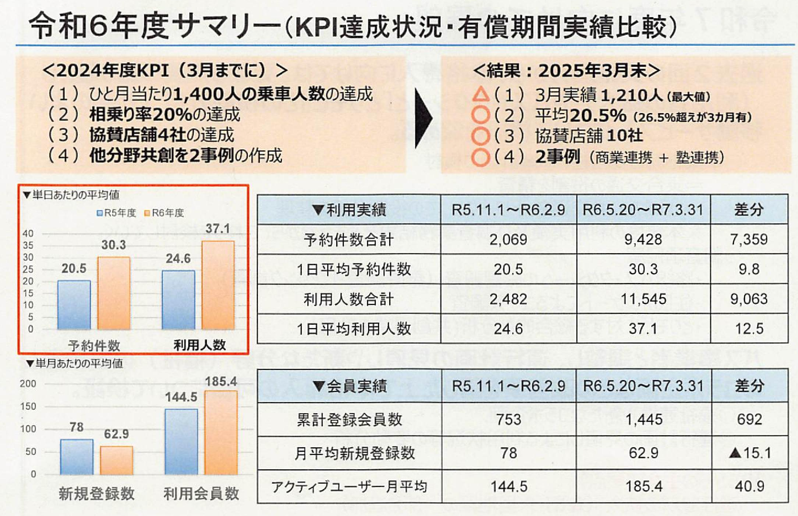 - 月最大利用者数:令和6年 1,210人(目標1,400人の約86%)、令和7年 1,769人(目標1,700人の104%)