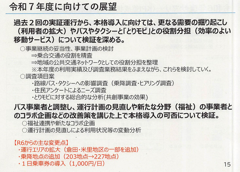 - バス・タクシーとの役割分担を再整理し、本格導入の可否を検証