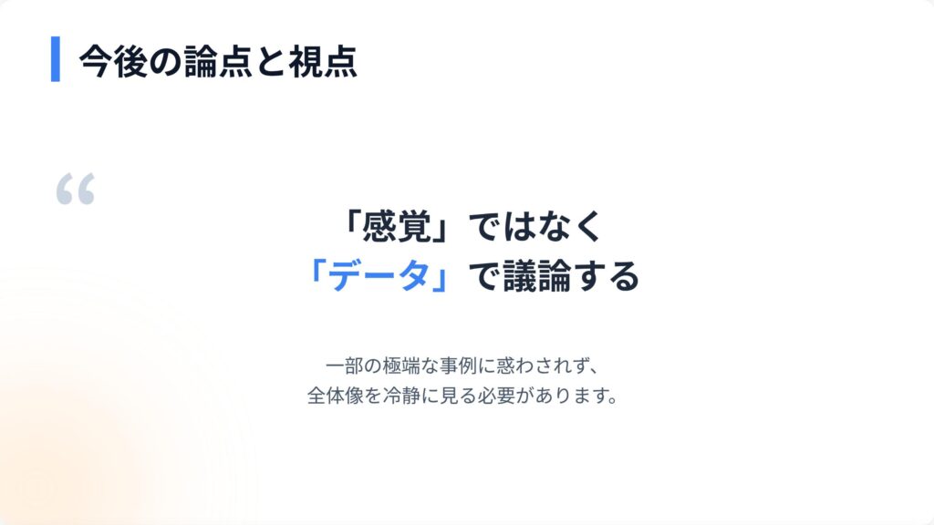 - 重要なのは、数字で全体像を見つつ、データの限界も踏まえて論点整理すること