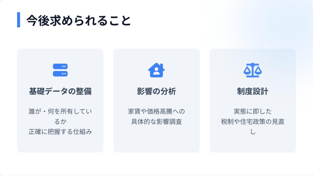 住宅政策や投資規制などを本格的に議論するなら、例えば次の論点が重要になります。