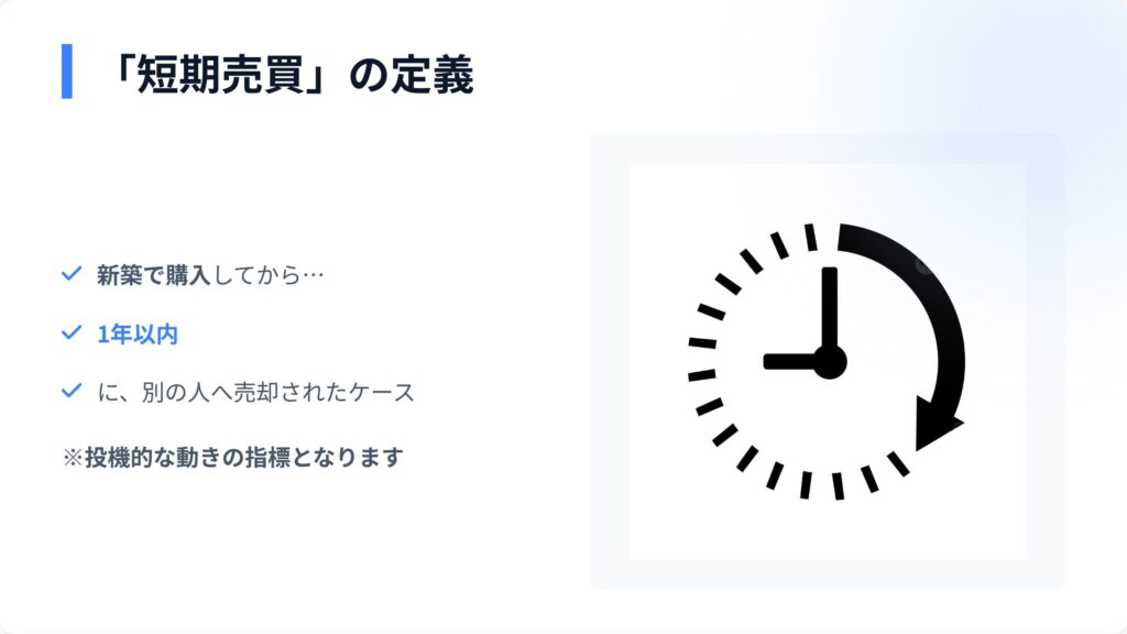 ここでいう短期売買とは、「新築で買ってから1年以内に別の人へ売られたケース」です。