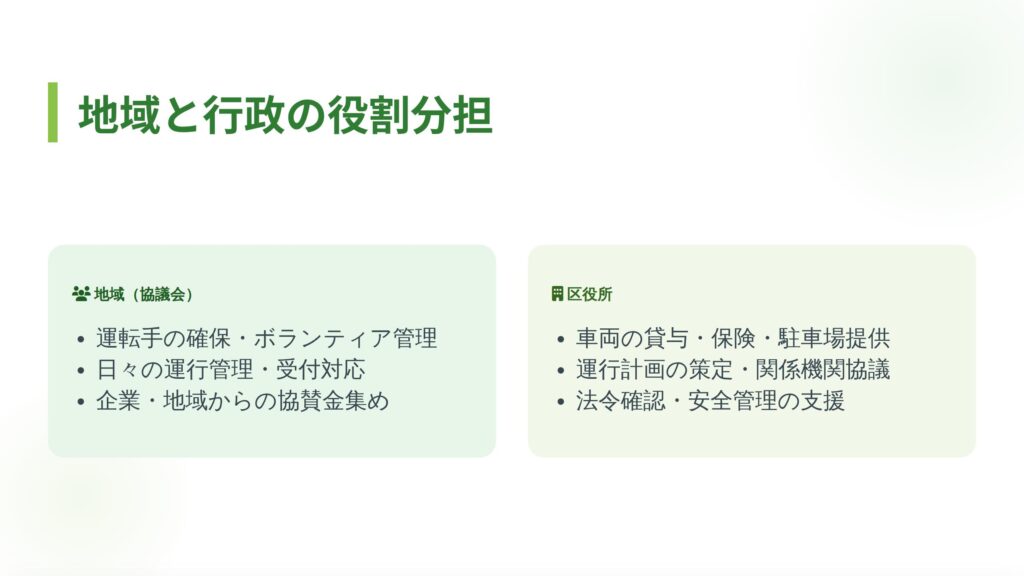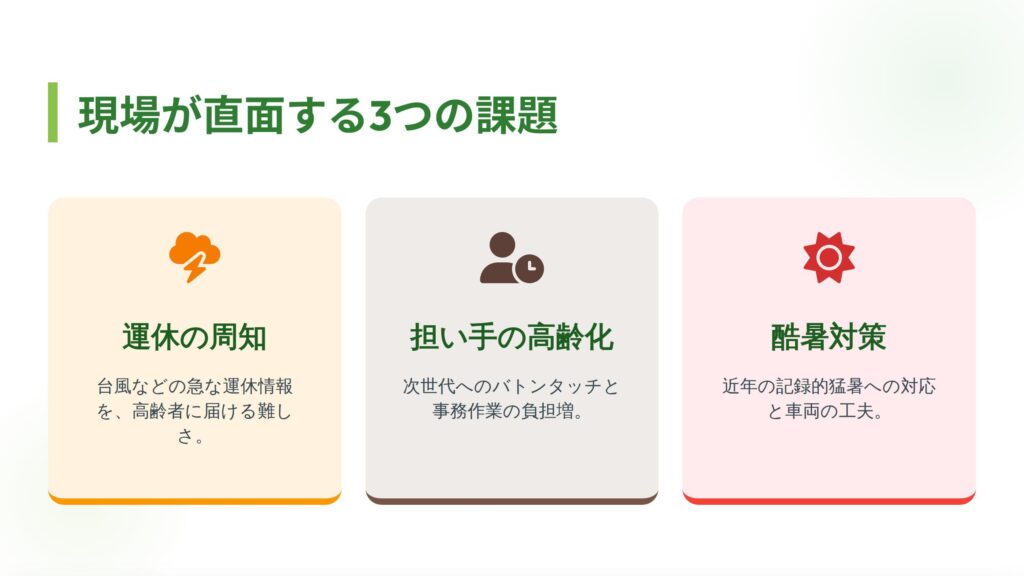 運転手・運営側が高齢化すると、次世代へのバトンタッチが課題になります。資料でも、運行規模が拡大すると内部事務の作業量が想定以上になる、という指摘がありました。