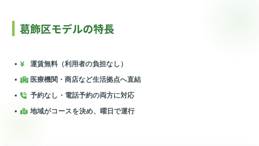 今回は、葛飾区で視察した「グリーンスローモビリティ」と「地域主体交通」の取組について、6つのパートに分けて分かりやすくご紹介します。