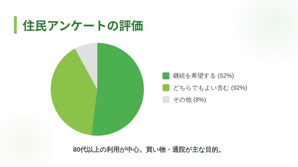 - 住民アンケートでは、運行継続を「希望する」が52%、「どちらでもない」を含めると92%